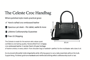 The Celeste is made for the woman who values quiet confidence and lasting quality. Handcrafted from richly textured, croc-embossed leather, it carries Clare’s 32-year heritage of leather artistry in every stitch. With dual top handles and a detachable strap, it shifts from shoulder bag to handheld in seconds—perfect for the multitasker who does it all.